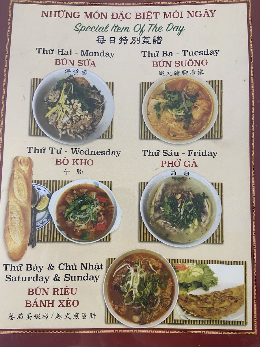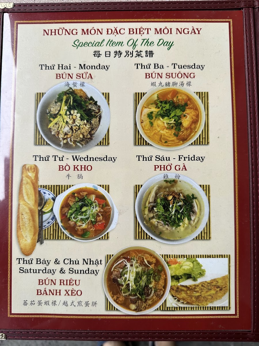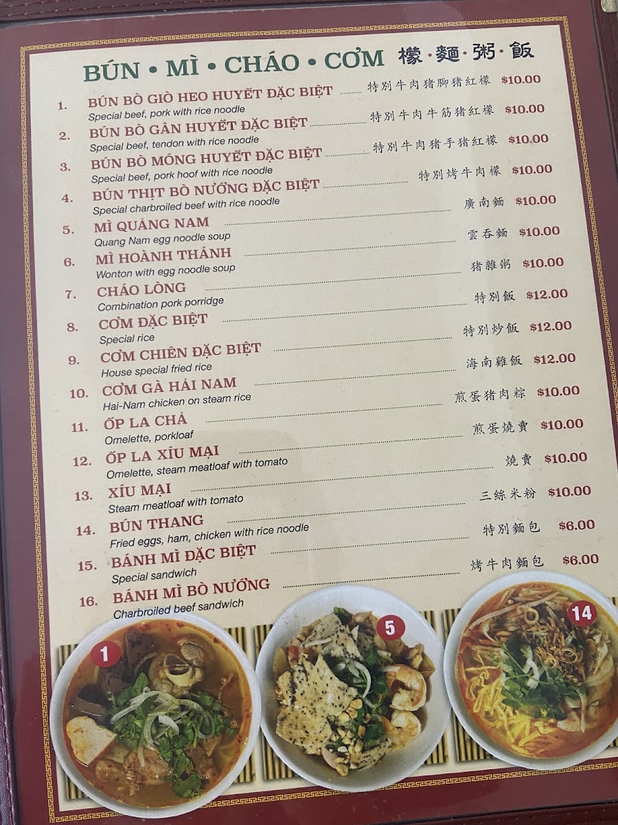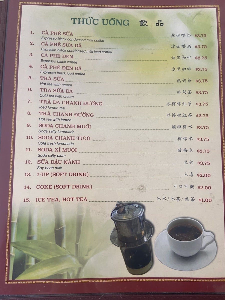 Thanh Thai Restaurant offers a diverse and flavorful menu that showcases traditional Vietnamese dishes. For noodle lovers, the Bún Bò Giò Heo Huyết Đặc Biệt and Bún Bò Gần Huyết Đặc Biệt stand out as hearty options, with their rich broths and tender beef, while the Bún Bò Mỏng Huyết Đặc Biệt adds a unique twist. Those seeking something more savory can try the Xíu Mại, a delightful combination of flavorful pork meatballs in a delicate broth. For a complete meal, there is also the special dish, 特別烤牛肉檬, offering a robust blend of grilled beef and noodles. As for drinks, the restaurant offers refreshing options like Cà Phê Sữa (Vietnamese iced milk coffee), Cà Phê Sữa Đá (iced milk coffee), and Cà Phê Đen Đá (iced black coffee), perfect for those looking to pair a traditional beverage with their meal. For a different flavor, Trà Sữa (milk tea) provides a sweet and satisfying option. Whether you’re craving comforting noodles, hearty meat dishes, or a fresh drink, Thanh Thai Restaurant delivers an authentic Vietnamese experience with every dish.